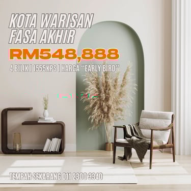 Rebut peluang untuk dapatkan harga ‘early bird’ untuk fasa terakhir Kota Warisan. Lokasi sangat strategic dengan pembangunan sekitar yang mampan.